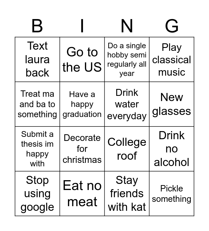 This bingo card has 16 words: Eat no meat, Drink no alcohol, Do a single hobby semi regularly all year, Text laura back, Submit a thesis im happy with, Go to the US, College roof, Stay friends with kat, Treat ma and ba to something, Have a happy graduation, Stop using google, Play classical music, Decorate for christmas, New glasses, Drink water everyday and Pickle something.