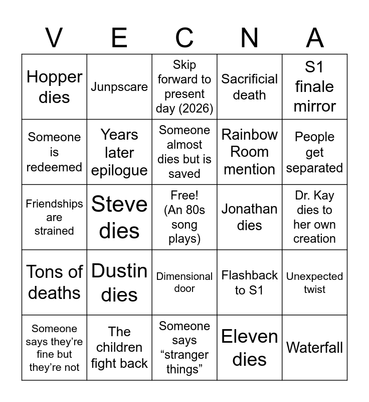 This bingo card has a free space and 51 words: Romantic Beat, Waterfall, D&D reference, Someone says “stranger things”, Dustin dies, “Halfway promise”, Junpscare, Mike makes an emotional speech, Someone is redeemed, “Friends don’t lie”, Years later epilogue, Sacrificial death, Unexpected twist, Flashback to S1, Call back to Papa, Will is passed out, Someone almost dies but is saved, Jonathan dies, Murray dies, S1 finale mirror, Steve dies, Eleven dies, Hopper dies, Rainbow Room mention, Red Harrington death (aka Steve), More on Vecna’s memories, People get separated, Rubix Cube comes back, Someone says they’re fine but they’re not, Skip forward to present day (2026), The abyss and normal world get merged fully, Will & Eleven Vs Vecna, Flashback to Hopper’s daughter, The ending feels unfinished on purpose, Skip forward to the 90s, The children fight back, Suicidal Hopper, Someone gets sucked into the outside of the wormhole, Sequel / spinoff bait, The military turn on Dr. Kay, Dr. Kay dies to her own creation, Tons of deaths, That ball of matter does something, Reveal that brenner actually was good, The Abyss isn’t what they think it is, Mind Battle, Friendships are strained, More confusing writing, You cry (or feel like you’re gonna cry), Dimensional door and Holly acts and saves / does something.