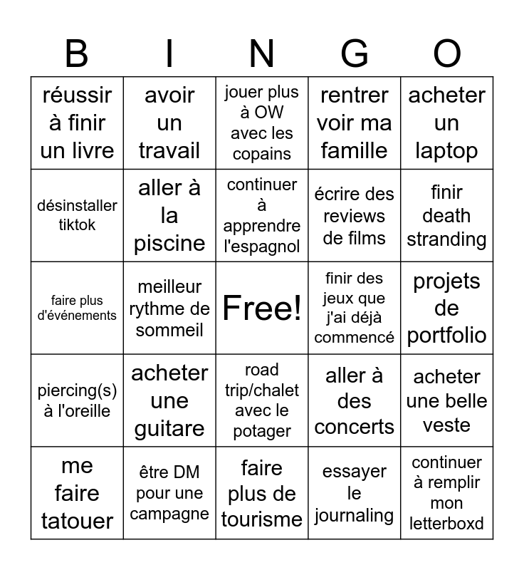 This bingo card has a free space and 24 words: acheter une guitare, être DM pour une campagne, continuer à apprendre l'espagnol, me faire tatouer, acheter un laptop, réussir à finir un livre, désinstaller tiktok, avoir un travail, finir des jeux que j'ai déjà commencé, road trip/chalet avec le potager, écrire des reviews de films, faire plus d'événements, aller à des concerts, acheter une belle veste, aller à la piscine, essayer le journaling, projets de portfolio, jouer plus à OW avec les copains, finir death stranding, meilleur rythme de sommeil, continuer à remplir mon letterboxd, piercing(s) à l'oreille, rentrer voir ma famille and faire plus de tourisme.
