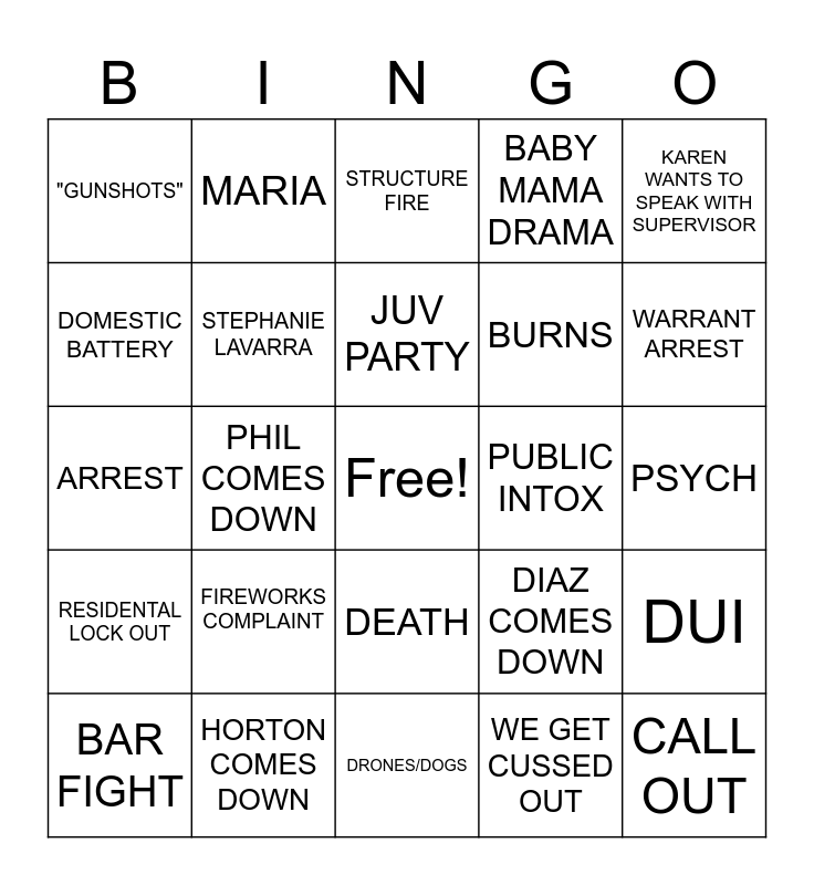This bingo card has a free space and 24 words: FIREWORKS COMPLAINT, HORTON COMES DOWN, JUV PARTY, BAR FIGHT, KAREN WANTS TO SPEAK WITH SUPERVISOR, "GUNSHOTS", DOMESTIC BATTERY, MARIA, PUBLIC INTOX, DEATH, BURNS, ARREST, DIAZ COMES DOWN, DUI, STEPHANIE LAVARRA, WE GET CUSSED OUT, PSYCH, STRUCTURE FIRE, WARRANT ARREST, PHIL COMES DOWN, CALL OUT, RESIDENTAL LOCK OUT, BABY MAMA DRAMA and DRONES/DOGS.