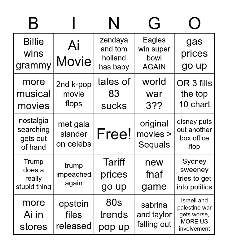 This bingo card has a free space and 24 words: trump impeached again, epstein files released, tales of 83 sucks, more Ai in stores, gas prices go up, Billie wins grammy, more musical movies, Ai Movie, original movies > Sequals, Tariff prices go up, world war 3??, nostalgia searching gets out of hand, new fnaf game, Sydney sweeney tries to get into politics, 2nd k-pop movie flops, sabrina and taylor falling out, disney puts out another box office flop, zendaya and tom holland has baby, OR 3 fills the top 10 chart, met gala slander on celebs, Israeli and palestine war gets worse, MORE US involvement, Trump does a really stupid thing, Eagles win super bowl AGAIN and 80s trends pop up.