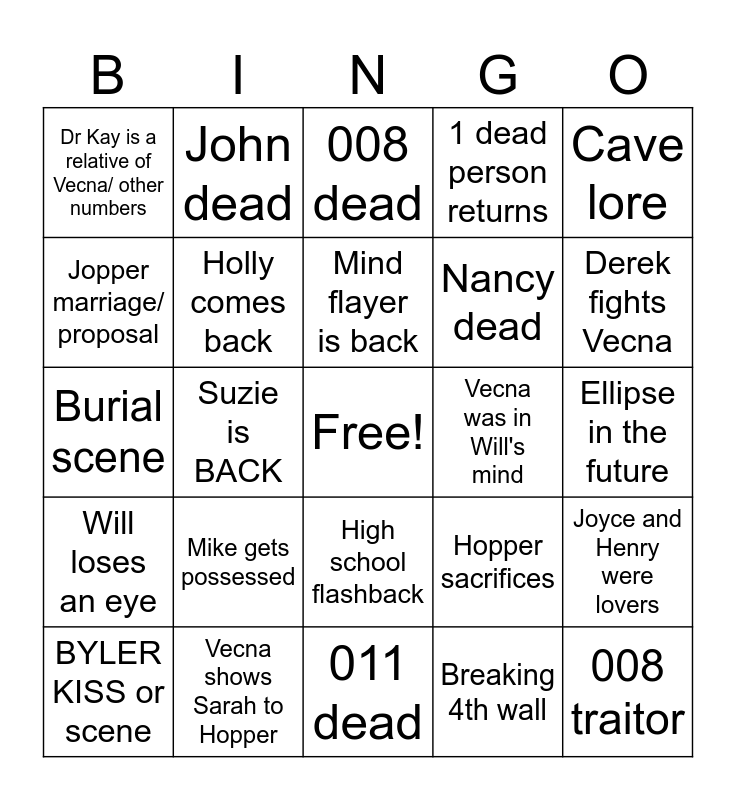 This bingo card has a free space and 24 words: Mike gets possessed, Vecna shows Sarah to Hopper, Mind flayer is back, BYLER KISS or scene, Cave lore, Dr Kay is a relative of Vecna/ other numbers, Jopper marriage/ proposal, John dead, Vecna was in Will's mind, High school flashback, Nancy dead, Burial scene, Hopper sacrifices, Joyce and Henry were lovers, Holly comes back, Breaking 4th wall, Ellipse in the future, 008 dead, Derek fights Vecna, Suzie is BACK, 008 traitor, Will loses an eye, 1 dead person returns and 011 dead.