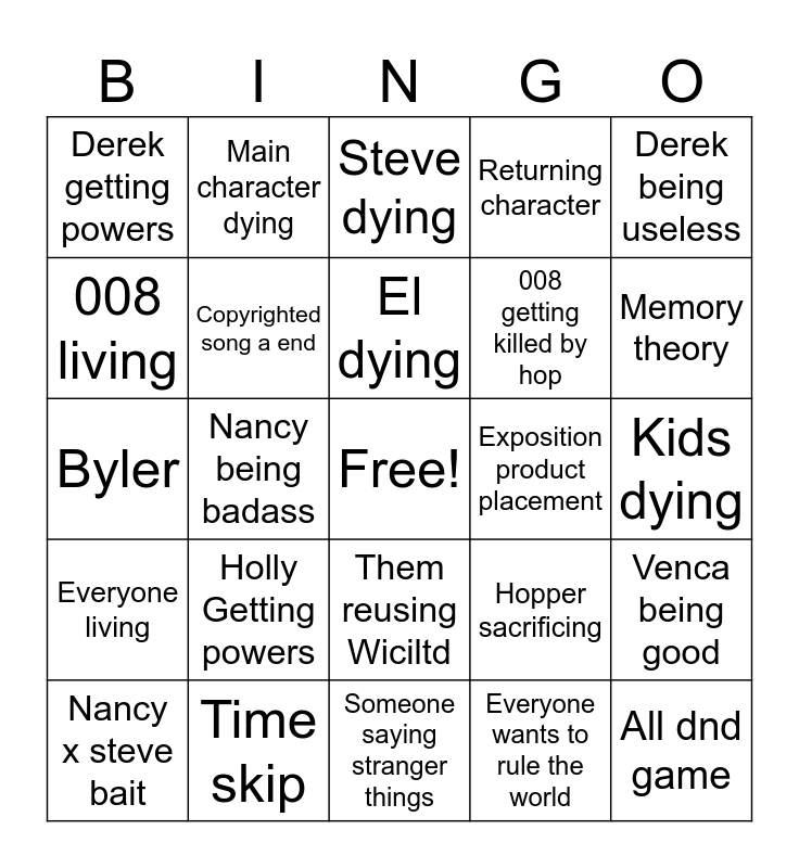 This bingo card has a free space and 24 words: Holly Getting powers, Time skip, El dying, Nancy x steve bait, Derek being useless, Derek getting powers, 008 living, Main character dying, Exposition product placement, Them reusing Wiciltd, 008 getting killed by hop, Byler, Hopper sacrificing, Venca being good, Copyrighted song a end, Everyone wants to rule the world, Kids dying, Steve dying, Memory theory, Nancy being badass, All dnd game, Everyone living, Returning character and Someone saying stranger things.