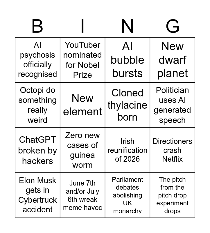 This bingo card has 16 words: June 7th and/or July 6th wreak meme havoc, Directioners crash Netflix, AI bubble bursts, AI psychosis officially recognised, ChatGPT broken by hackers, YouTuber nominated for Nobel Prize, Irish reunification of 2026, Parliament debates abolishing UK monarchy, Octopi do something really weird, New element, Elon Musk gets in Cybertruck accident, New dwarf planet, Zero new cases of guinea worm, Politician uses AI generated speech, Cloned thylacine born and The pitch from the pitch drop experiment drops.