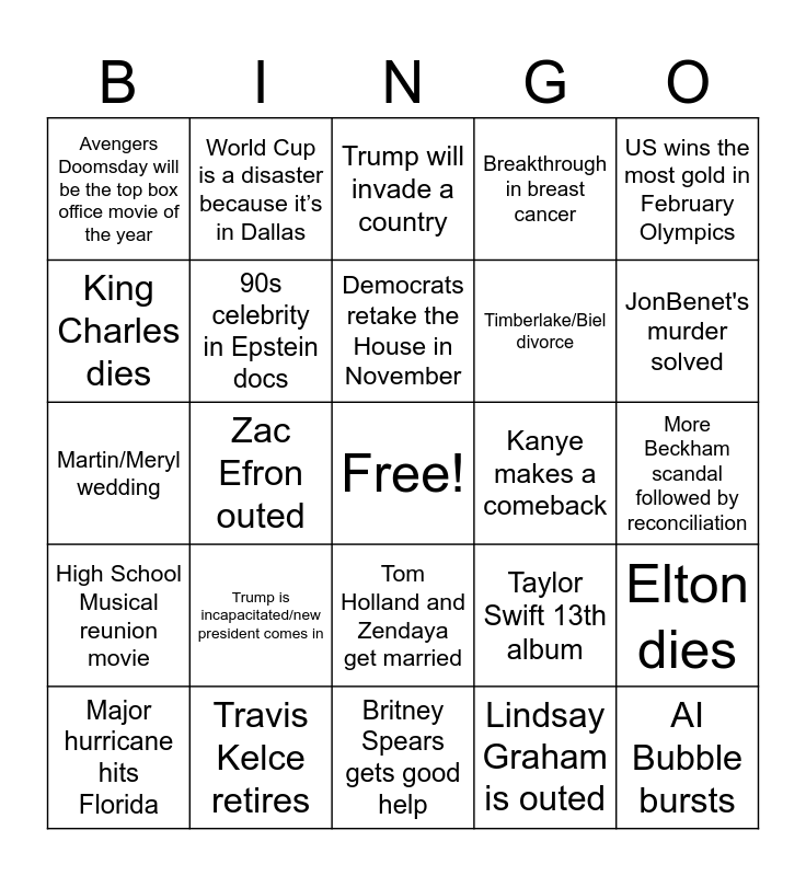 This bingo card has a free space and 24 words: Trump is incapacitated/new president comes in, Travis Kelce retires, Democrats retake the House in November, Major hurricane hits Florida, US wins the most gold in February Olympics, Avengers Doomsday will be the top box office movie of the year, King Charles dies, World Cup is a disaster because it’s in Dallas, Kanye makes a comeback, Tom Holland and Zendaya get married, Timberlake/Biel divorce, Martin/Meryl wedding, Taylor Swift 13th album, Elton dies, 90s celebrity in Epstein docs, Lindsay Graham is outed, More Beckham scandal followed by reconciliation, Trump will invade a country, JonBenet's murder solved, Zac Efron outed, AI Bubble bursts, High School Musical reunion movie, Breakthrough in breast cancer and Britney Spears gets good help.