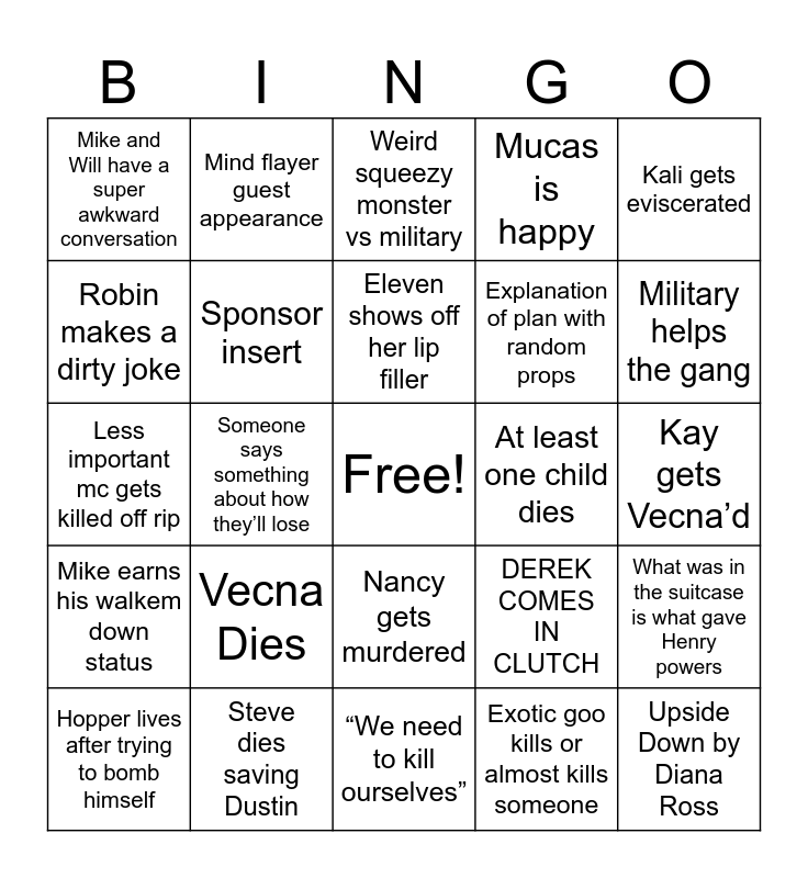 This bingo card has a free space and 24 words: Vecna Dies, Steve dies saving Dustin, Eleven shows off her lip filler, Hopper lives after trying to bomb himself, Kali gets eviscerated, Mike and Will have a super awkward conversation, Robin makes a dirty joke, Mind flayer guest appearance, At least one child dies, Nancy gets murdered, Explanation of plan with random props, Less important mc gets killed off rip, DEREK COMES IN CLUTCH, What was in the suitcase is what gave Henry powers, Sponsor insert, Exotic goo kills or almost kills someone, Kay gets Vecna’d, Weird squeezy monster vs military, Military helps the gang, Someone says something about how they’ll lose, Upside Down by Diana Ross, Mike earns his walkem down status, Mucas is happy and “We need to kill ourselves”.