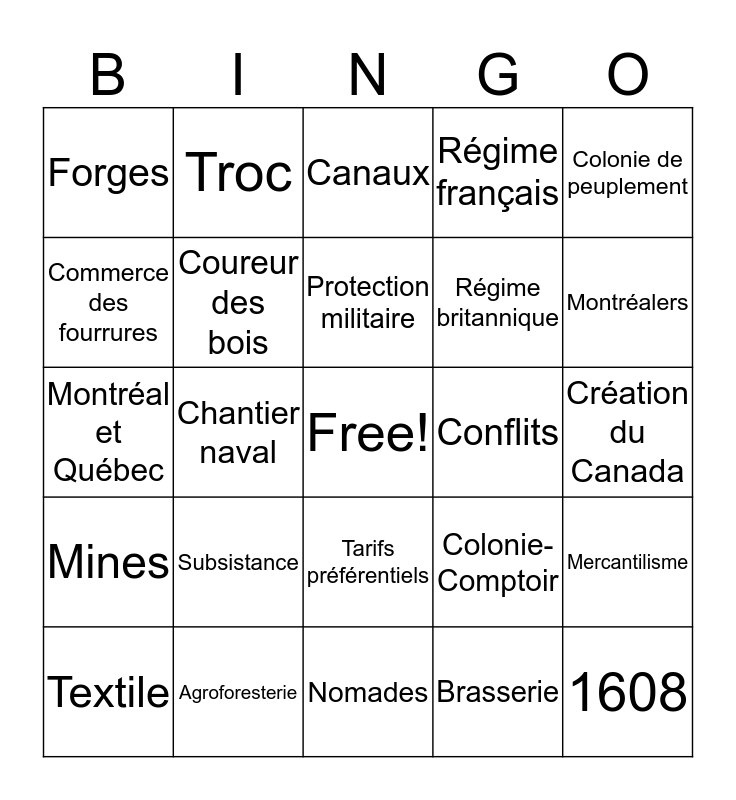 This bingo card has a free space and 50 words: Premiers occupants, 1608, Iroquois, Nomades, Subsistance, Routes commerciales, Troc, Pêche, Commerce des fourrures, Agriculture, Coureur des bois, Régime français, Mercantilisme, Colonie-Comptoir, Immense, Vallée du Saint-Laurent, Protection militaire, Conflits, Construction de forts, Colonie de peuplement, Chantier naval, Brasserie, Forges, Régime britannique, Hurons, 1760, Montréalers, Blocus continental, Canaux, Tarifs préférentiels, Bois, Protectionniste, Chemin de fer, Banques, Agroforesterie, Syndicats, Beurreries et fromageries, 1867, 1800, Création du Canada, Période contemporaine, Machine à vapeur, Charbon, Grande-Bretagne, Textile, Montréal et Québec, Électricité, États-Unis, Mines and Ouverture des régions.