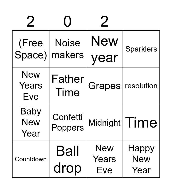 This bingo card has 16 words: Countdown, Ball drop, New year, Sparklers, New Years Eve, Noise makers, Midnight, Time, (Free Space), Father Time, New Years Eve, resolution, Baby New Year, Confetti Poppers, Grapes and Happy New Year.