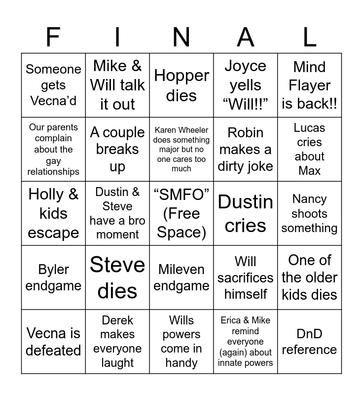 This bingo card has a free space and 24 words: Steve dies, Derek makes everyone laught, Karen Wheeler does something major but no one cares too much, Vecna is defeated, Mind Flayer is back!!, Someone gets Vecna’d, Our parents complain about the gay relationships, Mike & Will talk it out, Dustin cries, Mileven endgame, Robin makes a dirty joke, Holly & kids escape, Will sacrifices himself, One of the older kids dies, A couple breaks up, Erica & Mike remind everyone (again) about innate powers, Nancy shoots something, Hopper dies, Lucas cries about Max, Dustin & Steve have a bro moment, DnD reference, Byler endgame, Joyce yells “Will!!” and Wills powers come in handy.