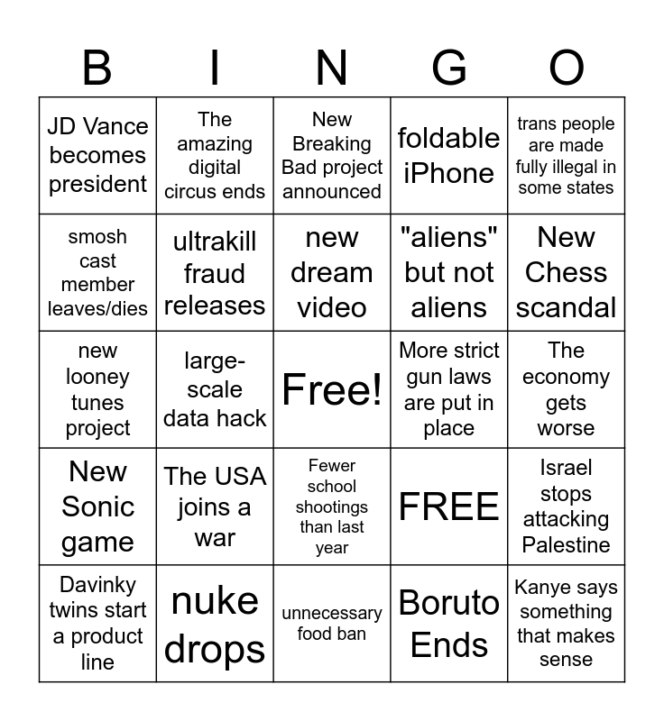 This bingo card has a free space and 25 words: The USA joins a war, unnecessary food ban, new dream video, Davinky twins start a product line, trans people are made fully illegal in some states, JD Vance becomes president, smosh cast member leaves/dies, The amazing digital circus ends, More strict gun laws are put in place, Fewer school shootings than last year, "aliens" but not aliens, new looney tunes project, FREE, Israel stops attacking Palestine, ultrakill fraud releases, another final terreria update, The economy gets worse, New Breaking Bad project announced, New Chess scandal, large-scale data hack, Kanye says something that makes sense, nuke drops, New Sonic game, foldable iPhone and Boruto Ends.