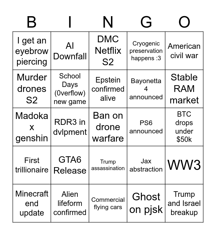 This bingo card has a free space and 24 words: GTA6 Release, Alien lifeform confirmed, Epstein confirmed alive, Minecraft end update, American civil war, I get an eyebrow piercing, Murder drones S2, AI Downfall, PS6 announced, Trump assassination, Bayonetta 4 announced, Madoka x genshin, Jax abstraction, WW3, School Days (0verflow) new game, Ghost on pjsk, BTC drops under $50k, DMC Netflix S2, Stable RAM market, RDR3 in dvlpment, Trump and Israel breakup, First trillionaire, Cryogenic preservation happens :3 and Commercial flying cars.