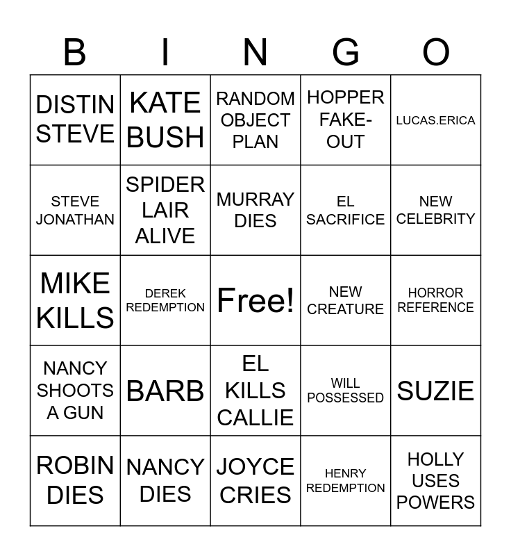 This bingo card has a free space and 24 words: BARB, NANCY DIES, MURRAY DIES, ROBIN DIES, LUCAS.ERICA, DISTIN STEVE, STEVE JONATHAN, KATE BUSH, NEW CREATURE, EL KILLS CALLIE, EL SACRIFICE, MIKE KILLS, WILL POSSESSED, SUZIE, SPIDER LAIR ALIVE, HENRY REDEMPTION, HORROR REFERENCE, RANDOM OBJECT PLAN, NEW CELEBRITY, DEREK REDEMPTION, HOLLY USES POWERS, NANCY SHOOTS A GUN, HOPPER FAKE-OUT and JOYCE CRIES.