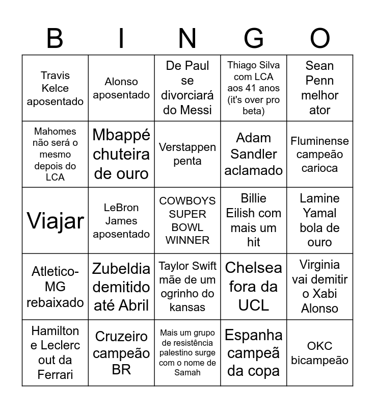 This bingo card has a free space and 24 words: Zubeldia demitido até Abril, Cruzeiro campeão BR, Verstappen penta, Hamilton e Leclerc out da Ferrari, Sean Penn melhor ator, Travis Kelce aposentado, Mahomes não será o mesmo depois do LCA, Alonso aposentado, Billie Eilish com mais um hit, Taylor Swift mãe de um ogrinho do kansas, Adam Sandler aclamado, Viajar, Chelsea fora da UCL, Virginia vai demitir o Xabi Alonso, Mbappé chuteira de ouro, Espanha campeã da copa, Lamine Yamal bola de ouro, De Paul se divorciará do Messi, Fluminense campeão carioca, LeBron James aposentado, OKC bicampeão, Atletico-MG rebaixado, Thiago Silva com LCA aos 41 anos (it's over pro beta) and Mais um grupo de resistência palestino surge com o nome de Samah.