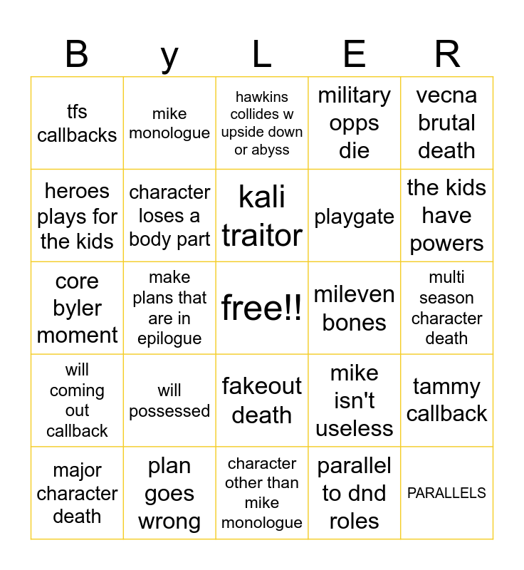 This bingo card has a free space and 24 words: will possessed, plan goes wrong, kali traitor, major character death, vecna brutal death, tfs callbacks, heroes plays for the kids, mike monologue, mileven bones, fakeout death, playgate, core byler moment, mike isn't useless, tammy callback, character loses a body part, parallel to dnd roles, multi season character death, hawkins collides w upside down or abyss, the kids have powers, make plans that are in epilogue, PARALLELS, will coming out callback, military opps die and character other than mike monologue.