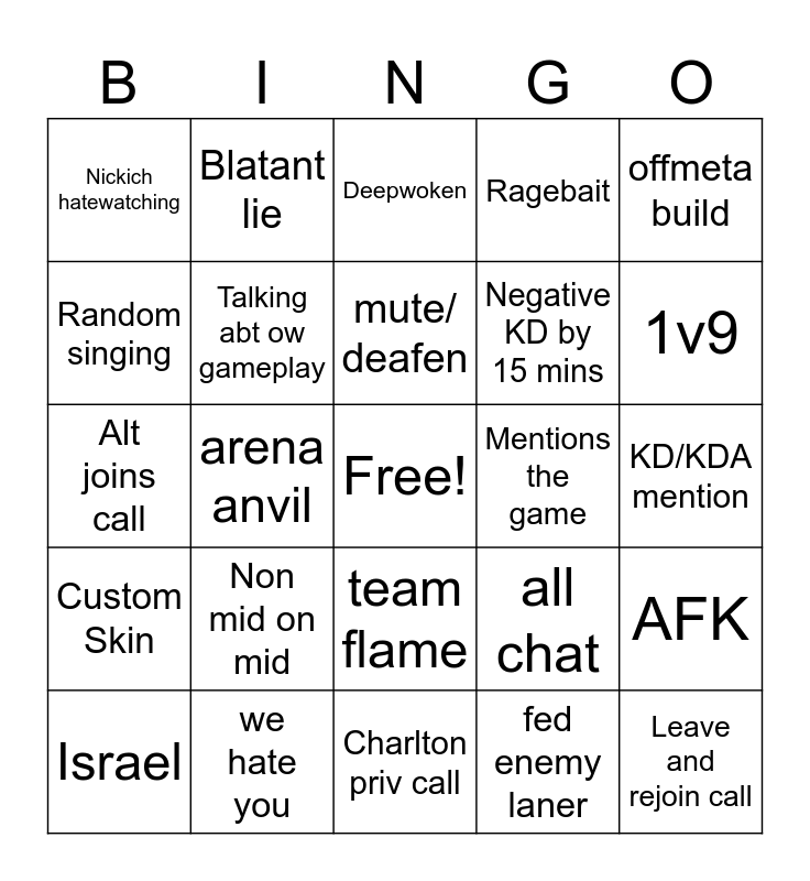 This bingo card has a free space and 24 words: Non mid on mid, we hate you, mute/ deafen, Israel, offmeta build, Nickich hatewatching, Random singing, Blatant lie, Mentions the game, team flame, Negative KD by 15 mins, Alt joins call, all chat, AFK, Talking abt ow gameplay, fed enemy laner, KD/KDA mention, Deepwoken, 1v9, arena anvil, Leave and rejoin call, Custom Skin, Ragebait and Charlton priv call.
