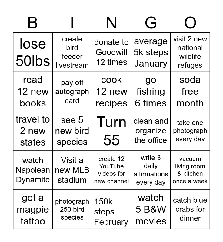 This bingo card has a free space and 24 words: Visit a new MLB stadium, photograph 250 bird species, cook 12 new recipes, get a magpie tattoo, visit 2 new national wildlife refuges, lose 50lbs, read 12 new books, create bird feeder livestream, clean and organize the office, create 12 YouTube videos for new channel, go fishing 6 times, travel to 2 new states, write 3 daily affirmations every day, vacuum living room & kitchen once a week, pay off autograph card, watch 5 B&W movies, take one photograph every day, donate to Goodwill 12 times, soda free month, see 5 new bird species, catch blue crabs for dinner, watch Napolean Dynamite, average 5k steps January and 150k steps February.