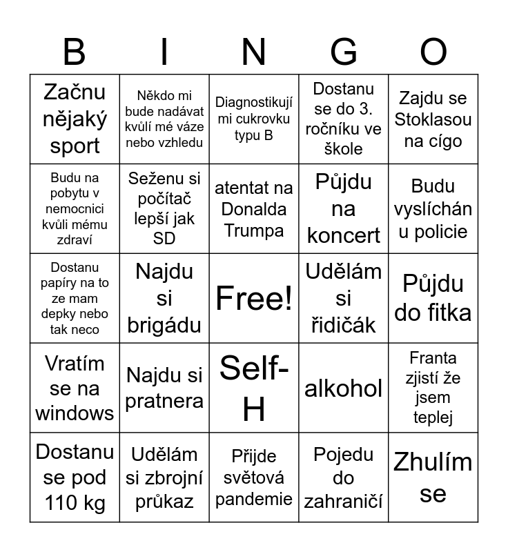 This bingo card has a free space and 24 words: Najdu si pratnera, Udělám si zbrojní průkaz, atentat na Donalda Trumpa, Dostanu se pod 110 kg, Zajdu se Stoklasou na cígo, Začnu nějaký sport, Budu na pobytu v nemocnici kvůli mému zdraví, Někdo mi bude nadávat kvůlí mé váze nebo vzhledu, Udělám si řidičák, Self-H, Půjdu na koncert, Dostanu papíry na to ze mam depky nebo tak neco, alkohol, Franta zjistí že jsem teplej, Seženu si počítač lepší jak SD, Pojedu do zahraničí, Půjdu do fitka, Diagnostikují mi cukrovku typu B, Budu vyslíchán u policie, Najdu si brigádu, Zhulím se, Vratím se na windows, Dostanu se do 3. ročníku ve škole and Přijde světová pandemie.