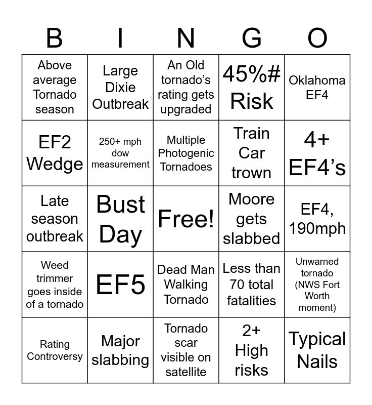 This bingo card has a free space and 24 words: EF5, Major slabbing, Multiple Photogenic Tornadoes, Rating Controversy, Oklahoma EF4, Above average Tornado season, EF2 Wedge, Large Dixie Outbreak, Moore gets slabbed, Dead Man Walking Tornado, Train Car trown, Late season outbreak, Less than 70 total fatalities, Unwarned tornado (NWS Fort Worth moment), 250+ mph dow measurement, 2+ High risks, EF4, 190mph, An Old tornado’s rating gets upgraded, 4+ EF4’s, Bust Day, Typical Nails, Weed trimmer goes inside of a tornado, 45%# Risk and Tornado scar visible on satellite.