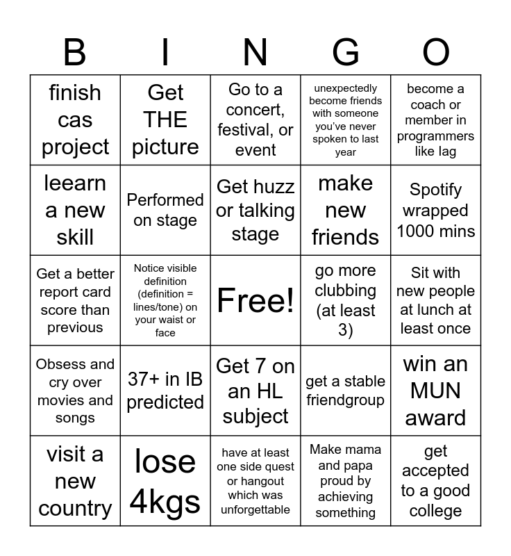 This bingo card has a free space and 24 words: 37+ in IB predicted, lose 4kgs, Get huzz or talking stage, visit a new country, become a coach or member in programmers like Iag, finish cas project, leearn a new skill, Get THE picture, go more clubbing (at least 3), Get 7 on an HL subject, make new friends, Get a better report card score than previous, get a stable friendgroup, win an MUN award, Performed on stage, Make mama and papa proud by achieving something, Sit with new people at lunch at least once, Go to a concert, festival, or event, Spotify wrapped 1000 mins, Notice visible definition (definition = lines/tone) on your waist or face, get accepted to a good college, Obsess and cry over movies and songs, unexpectedly become friends with someone you’ve never spoken to last year and have at least one side quest or hangout which was unforgettable.