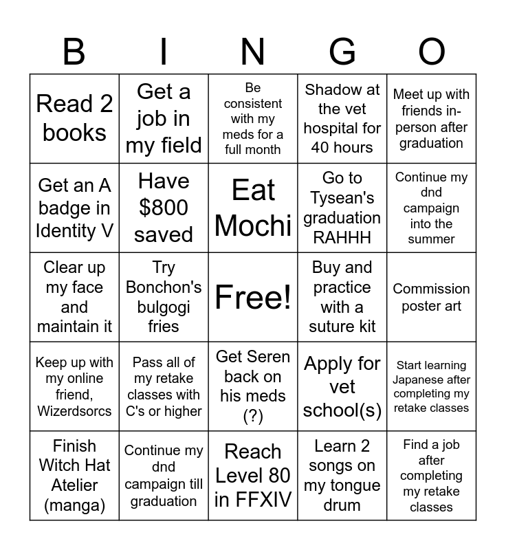 This bingo card has a free space and 24 words: Pass all of my retake classes with C's or higher, Continue my dnd campaign till graduation, Eat Mochi, Finish Witch Hat Atelier (manga), Meet up with friends in-person after graduation, Read 2 books, Get an A badge in Identity V, Get a job in my field, Buy and practice with a suture kit, Get Seren back on his meds (?), Go to Tysean's graduation RAHHH, Clear up my face and maintain it, Apply for vet school(s), Start learning Japanese after completing my retake classes, Have $800 saved, Learn 2 songs on my tongue drum, Commission poster art, Be consistent with my meds for a full month, Continue my dnd campaign into the summer, Try Bonchon's bulgogi fries, Find a job after completing my retake classes, Keep up with my online friend, Wizerdsorcs, Shadow at the vet hospital for 40 hours and Reach Level 80 in FFXIV.