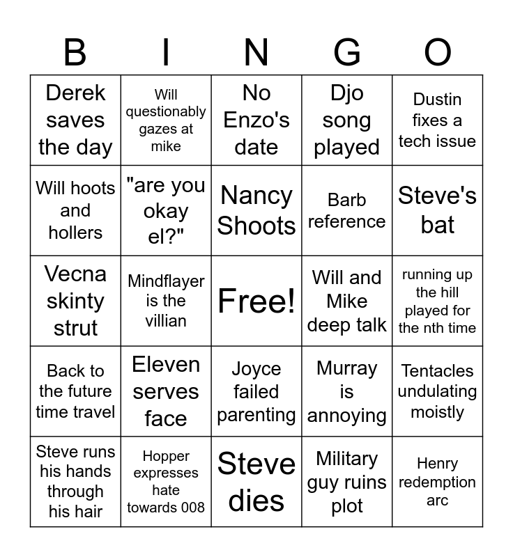 This bingo card has a free space and 24 words: Eleven serves face, Hopper expresses hate towards 008, Nancy Shoots, Steve runs his hands through his hair, Dustin fixes a tech issue, Derek saves the day, Will hoots and hollers, Will questionably gazes at mike, Will and Mike deep talk, Joyce failed parenting, Barb reference, Vecna skinty strut, Murray is annoying, Tentacles undulating moistly, "are you okay el?", Military guy ruins plot, running up the hill played for the nth time, No Enzo's date, Steve's bat, Mindflayer is the villian, Henry redemption arc, Back to the future time travel, Djo song played and Steve dies.