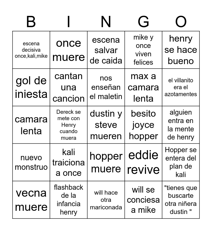 This bingo card has a free space and 24 words: kali traiciona a once, flashback de la infancia henry, nos enseñan el maletin, vecna muere, henry se hace bueno, escena decisiva once,kali,mike, gol de iniesta, once muere, besito joyce hopper, hopper muere, max a camara lenta, camara lenta, eddie revive, Hopper se entera del plan de kali, cantan una cancion, will se conciesa a mike, alguien entra en la mente de henry, escena salvar de caida, el villanito era el azotamentes, Dereck se mete con Henry cuando muera, "tienes que buscarte otra niñera dustin ", nuevo monstruo, mike y once viven felices and will hace otra mariconada.