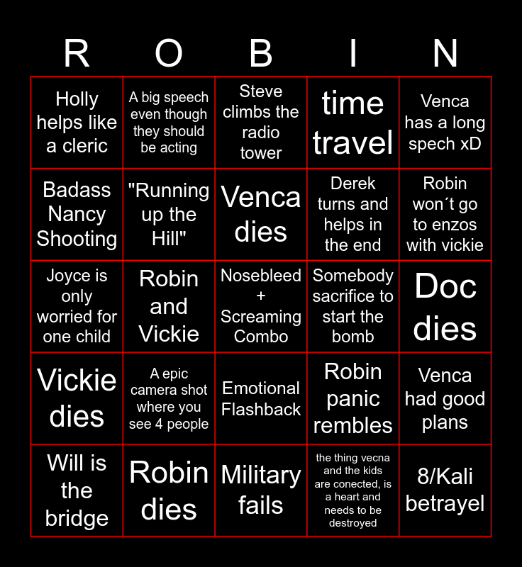 This bingo card has a free space and 24 words: A epic camera shot where you see 4 people, Robin dies, Venca dies, Will is the bridge, Venca has a long spech xD, Holly helps like a cleric, Badass Nancy Shooting, A big speech even though they should be acting, Somebody sacrifice to start the bomb, Emotional Flashback, Derek turns and helps in the end, Joyce is only worried for one child, Robin panic rembles, Venca had good plans, "Running up the Hill", the thing vecna and the kids are conected, is a heart and needs to be destroyed, Doc dies, Steve climbs the radio tower, Robin won´t go to enzos with vickie, Robin and Vickie, 8/Kali betrayel, Vickie dies, time travel and Military fails.