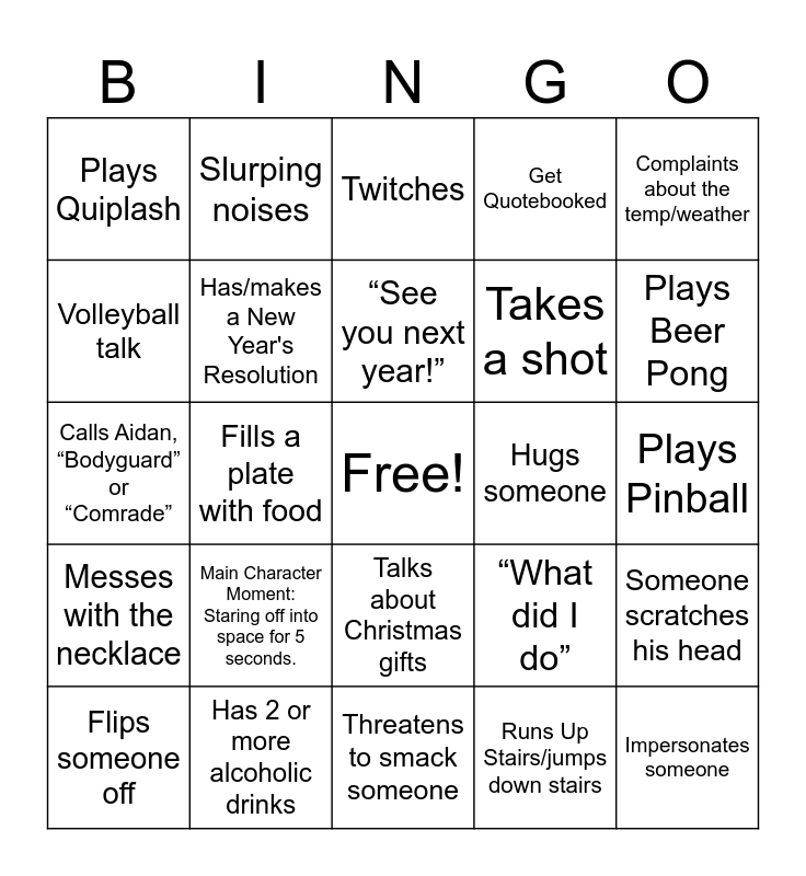 This bingo card has a free space and 27 words: “What did I do”, Reads quotebook, Takes a shot, Threatens to smack someone, Volleyball talk, Twitches, Slurping noises, Messes with the necklace, Hugs someone, Someone scratches his head, Calls Aidan, “Bodyguard” or “Comrade”, Get Quotebooked, Flips someone off, Has 2 or more alcoholic drinks, Plays Beer Pong, Says a curse word, Has/makes a New Year's Resolution, “See you next year!”, Main Character Moment: Staring off into space for 5 seconds., Plays Quiplash, Plays Pinball, Runs Up Stairs/jumps down stairs, Fills a plate with food, Impersonates someone, Talks about Christmas gifts, Complaints about the temp/weather and Drinks water.