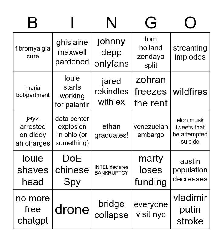 This bingo card has a free space and 24 words: DoE chinese Spy, drone, jared rekindles with ex, no more free chatgpt, streaming implodes, fibromyalgia cure, maria bobpartment, ghislaine maxwell pardoned, venezuelan embargo, INTEL declares BANKRUPTCY, zohran freezes the rent, jayz arrested on diddy ah charges, marty loses funding, austin population decreases, louie starts working for palantir, everyone visit nyc, elon musk tweets that he attempted suicide, johnny depp onlyfans, wildfires, data center explosion in ohio (or something), vladimir putin stroke, louie shaves head, tom holland zendaya split and bridge collapse.