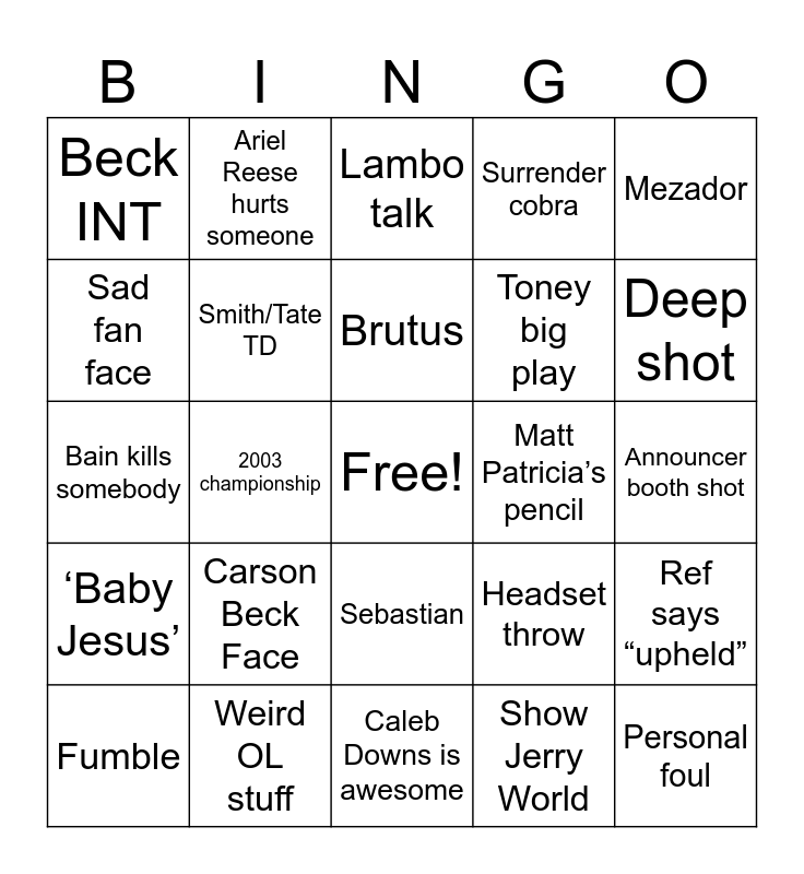 This bingo card has a free space and 24 words: Carson Beck Face, Weird OL stuff, Brutus, Fumble, Mezador, Beck INT, Sad fan face, Ariel Reese hurts someone, Matt Patricia’s pencil, Sebastian, Toney big play, Bain kills somebody, Headset throw, Ref says “upheld”, Smith/Tate TD, Show Jerry World, Announcer booth shot, Lambo talk, Deep shot, 2003 championship, Personal foul, ‘Baby Jesus’, Surrender cobra and Caleb Downs is awesome.