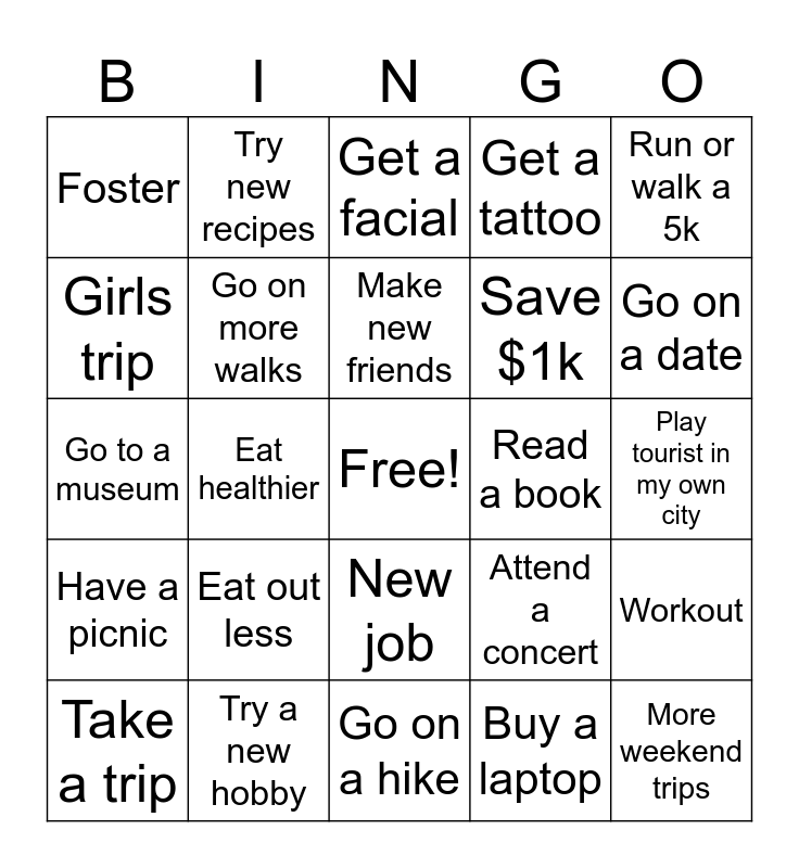 This bingo card has a free space and 24 words: Eat out less, Try a new hobby, Make new friends, Take a trip, Run or walk a 5k, Foster, Girls trip, Try new recipes, Read a book, New job, Save $1k, Go to a museum, Attend a concert, Workout, Go on more walks, Buy a laptop, Play tourist in my own city, Get a facial, Go on a date, Eat healthier, More weekend trips, Have a picnic, Get a tattoo and Go on a hike.