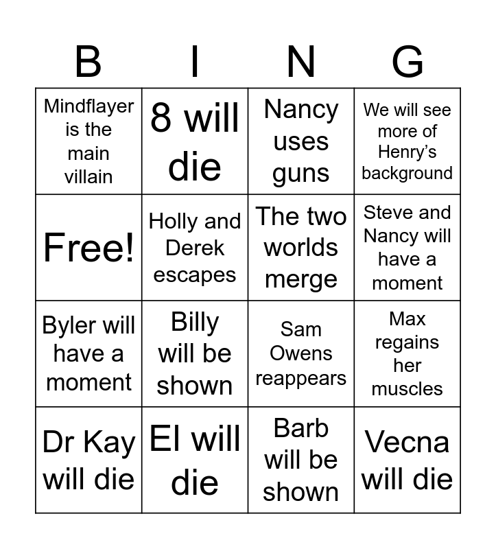 This bingo card has 16 words: El will die, Max regains her muscles, Nancy uses guns, Mindflayer is the main villain, Byler will have a moment, 8 will die, Sam Owens reappears, Barb will be shown, Free!, Holly and Derek escapes, Dr Kay will die, We will see more of Henry’s background, Billy will be shown, Steve and Nancy will have a moment, The two worlds merge and Vecna will die.