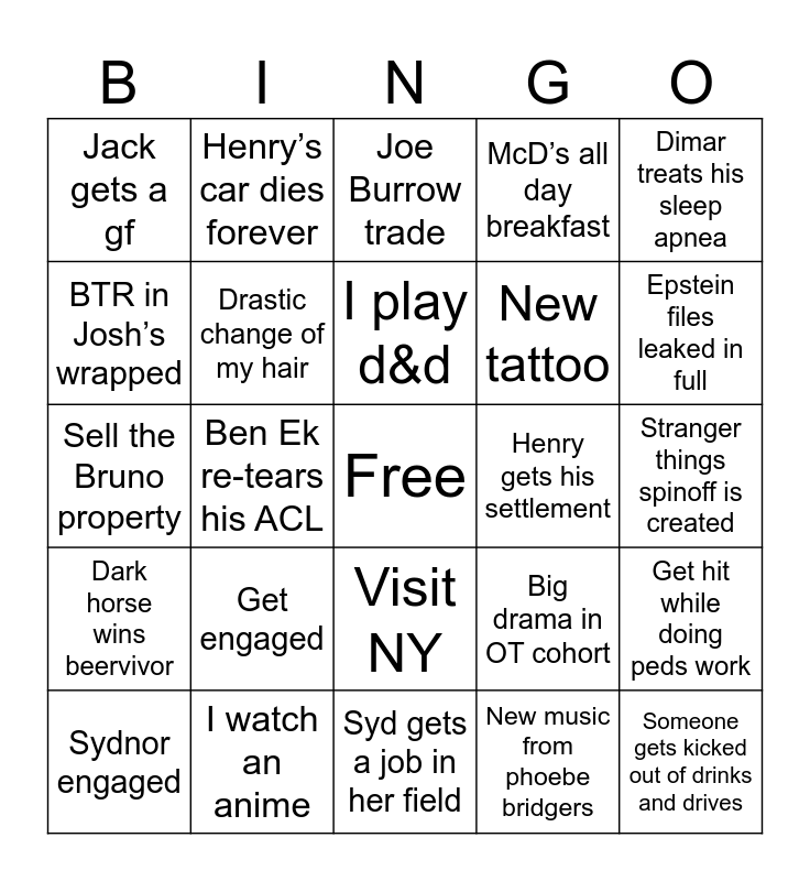 This bingo card has a free space and 24 words: Get engaged, I watch an anime, I play d&d, Sydnor engaged, Dimar treats his sleep apnea, Jack gets a gf, BTR in Josh’s wrapped, Henry’s car dies forever, Henry gets his settlement, Visit NY, New tattoo, Sell the Bruno property, Big drama in OT cohort, Get hit while doing peds work, Drastic change of my hair, New music from phoebe bridgers, Stranger things spinoff is created, Joe Burrow trade, Epstein files leaked in full, Ben Ek re-tears his ACL, Someone gets kicked out of drinks and drives, Dark horse wins beervivor, McD’s all day breakfast and Syd gets a job in her field.