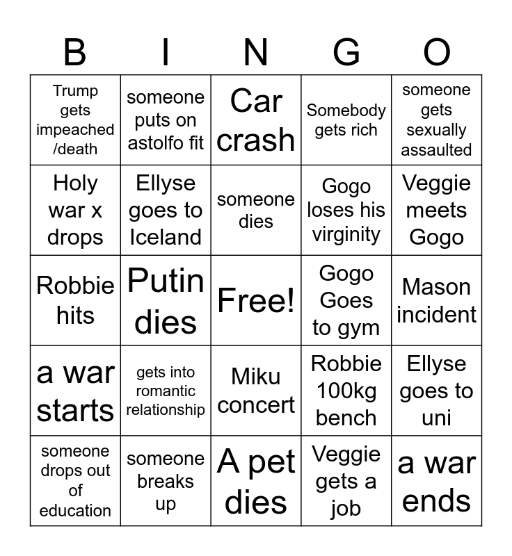 This bingo card has a free space and 24 words: gets into romantic relationship, someone breaks up, someone dies, someone drops out of education, someone gets sexually assaulted, Trump gets impeached /death, Holy war x drops, someone puts on astolfo fit, Gogo Goes to gym, Miku concert, Gogo loses his virginity, Robbie hits, Robbie 100kg bench, Ellyse goes to uni, Ellyse goes to Iceland, Veggie gets a job, Mason incident, Car crash, Veggie meets Gogo, Putin dies, a war ends, a war starts, Somebody gets rich and A pet dies.