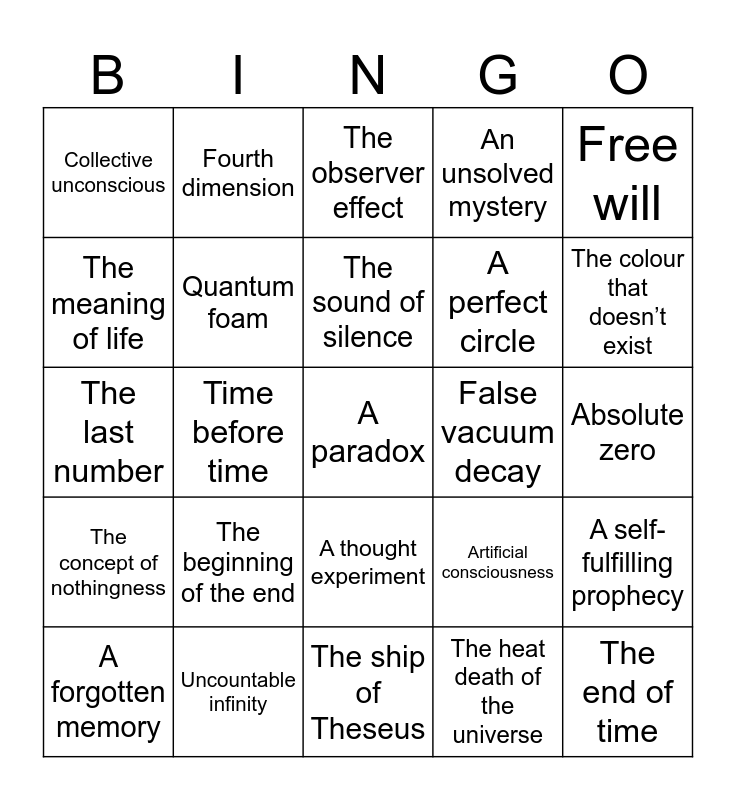 This bingo card has 25 words: The concept of nothingness, Uncountable infinity, A paradox, The heat death of the universe, Free will, Collective unconscious, Fourth dimension, The observer effect, False vacuum decay, A self-fulfilling prophecy, The meaning of life, Quantum foam, The ship of Theseus, Artificial consciousness, The colour that doesn’t exist, A forgotten memory, Time before time, The sound of silence, A perfect circle, Absolute zero, The last number, The beginning of the end, A thought experiment, An unsolved mystery and The end of time.