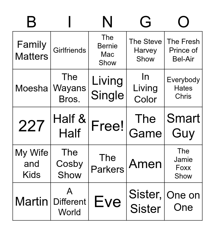 This bingo card has a free space and 24 words: The Cosby Show, A Different World, Living Single, Martin, The Fresh Prince of Bel-Air, Family Matters, Moesha, Girlfriends, The Game, The Parkers, In Living Color, 227, Amen, The Jamie Foxx Show, The Wayans Bros., Sister, Sister, Smart Guy, The Bernie Mac Show, Everybody Hates Chris, Half & Half, One on One, My Wife and Kids, The Steve Harvey Show and Eve.