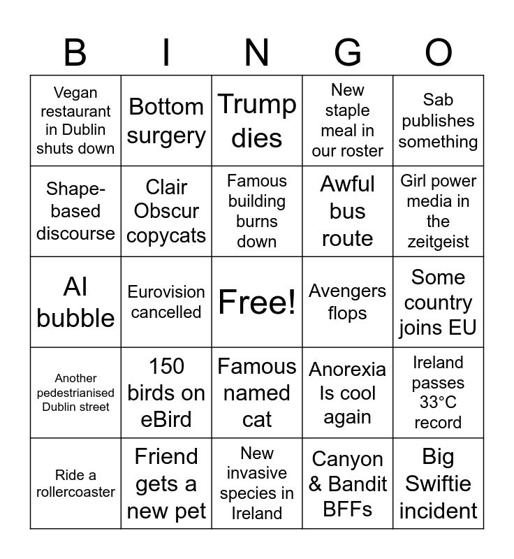 This bingo card has a free space and 24 words: 150 birds on eBird, Friend gets a new pet, Famous building burns down, Ride a rollercoaster, Sab publishes something, Vegan restaurant in Dublin shuts down, Shape-based discourse, Bottom surgery, Avengers flops, Famous named cat, Awful bus route, AI bubble, Anorexia Is cool again, Ireland passes 33°C record, Clair Obscur copycats, Canyon & Bandit BFFs, Some country joins EU, Trump dies, Girl power media in the zeitgeist, Eurovision cancelled, Big Swiftie incident, Another pedestrianised Dublin street, New staple meal in our roster and New invasive species in Ireland.