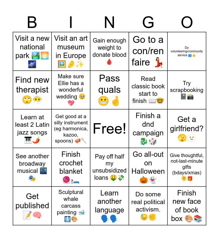 This bingo card has a free space and 24 words: Finish crochet blanket π§ΆποΈ, Sculptural whale carcass painting ππ©»π¨, Pass quals π¬π€, Get published ππ§ , Do volunteering/community service π₯π, Visit a new national park ποΈπ π, Find new therapist ππΆβπ«οΈ, Visit an art museum in Europe πΌοΈπ€β¨, Finish a dnd campaign ππ², Pay off half my unsubsidized loans π€πΈ, Read classic book start to finish ππ€, Learn at least 2 Latin jazz songs πΉπΆοΈ, Go all-out on Halloween ππ», Give thoughtful, not-last-minute gifts (bdays/xmas) π« π, Make sure Ellie has a wonderful wedding π₯Ήπ, Do some real political activism. πβ, Get a girlfriend? π«£π«₯, Gain enough weight to donate blood π©Έ, Try scrapbooking ππΈ, Get good at a silly instrument (eg harmonica, kazoo, spoons) πͺπ₯, Finish new face of book box π¨π, See another broadway musical ππ, Go to a con/ren faire ππ» and Learn another language π£οΈπ£οΈ.