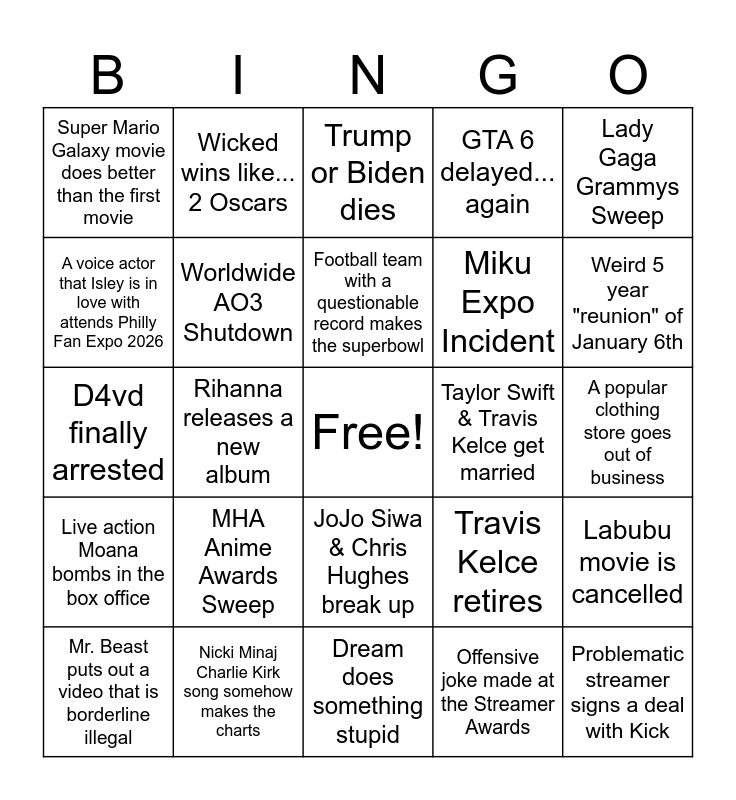 This bingo card has a free space and 24 words: MHA Anime Awards Sweep, Nicki Minaj Charlie Kirk song somehow makes the charts, Football team with a questionable record makes the superbowl, Mr. Beast puts out a video that is borderline illegal, Lady Gaga Grammys Sweep, Super Mario Galaxy movie does better than the first movie, A voice actor that Isley is in love with attends Philly Fan Expo 2026, Wicked wins like... 2 Oscars, Taylor Swift & Travis Kelce get married, JoJo Siwa & Chris Hughes break up, Miku Expo Incident, D4vd finally arrested, Travis Kelce retires, Labubu movie is cancelled, Worldwide AO3 Shutdown, Offensive joke made at the Streamer Awards, A popular clothing store goes out of business, Trump or Biden dies, Weird 5 year "reunion" of January 6th, Rihanna releases a new album, Problematic streamer signs a deal with Kick, Live action Moana bombs in the box office, GTA 6 delayed... again and Dream does something stupid.