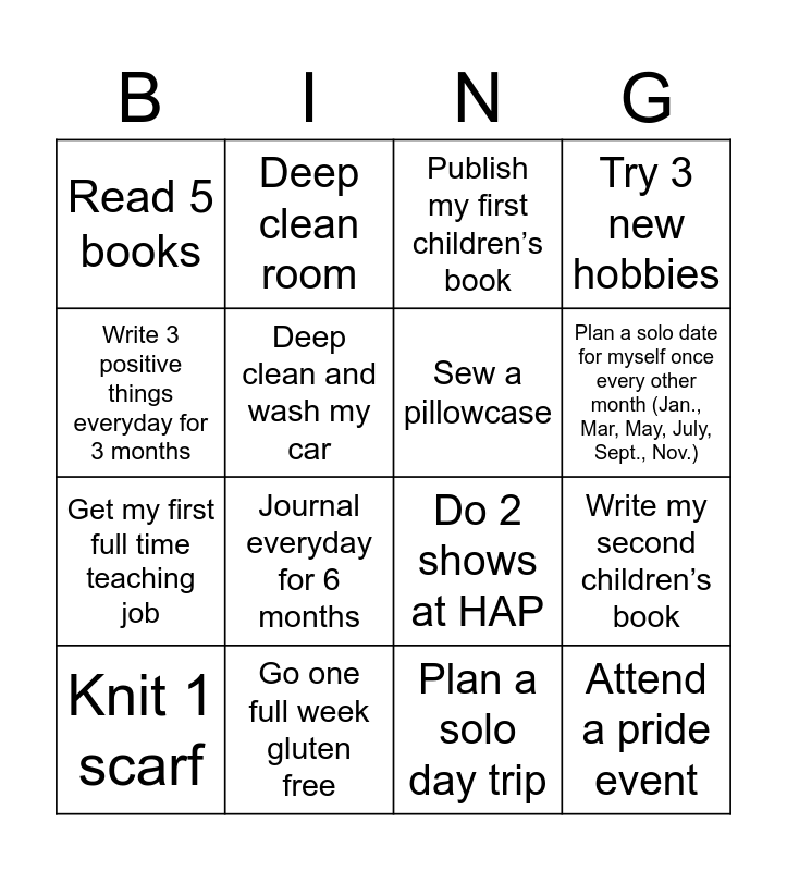 This bingo card has 16 words: Go one full week gluten free, Write my second children’s book, Publish my first children’s book, Read 5 books, Get my first full time teaching job, Deep clean room, Do 2 shows at HAP, Plan a solo day trip, Write 3 positive things everyday for 3 months, Deep clean and wash my car, Knit 1 scarf, Try 3 new hobbies, Journal everyday for 6 months, Plan a solo date for myself once every other month (Jan., Mar, May, July, Sept., Nov.), Sew a pillowcase and Attend a pride event.