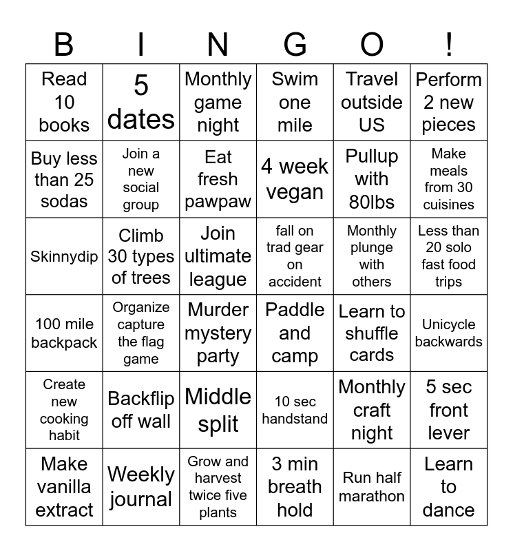This bingo card has 36 words: 10 sec handstand, Middle split, 3 min breath hold, Buy less than 25 sodas, 100 mile backpack, fall on trad gear on accident, Join a new social group, Grow and harvest twice five plants, Travel outside US, Monthly craft night, Make meals from 30 cuisines, Swim one mile, 5 sec front lever, Climb 30 types of trees, 4 week vegan, Read 10 books, Create new cooking habit, Monthly plunge with others, Skinnydip, Monthly game night, Join ultimate league, Organize capture the flag game, Paddle and camp, Murder mystery party, Learn to shuffle cards, 5 dates, Pullup with 80lbs, Weekly journal, Eat fresh pawpaw, Perform 2 new pieces, Learn to dance, Make vanilla extract, Unicycle backwards, Less than 20 solo fast food trips, Backflip off wall and Run half marathon.