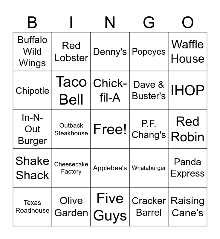 This bingo card has a free space and 24 words: Cheesecake Factory, Olive Garden, Chick-fil-A, Texas Roadhouse, Waffle House, Buffalo Wild Wings, Chipotle, Red Lobster, P.F. Chang's, Applebee's, Dave & Buster's, In-N-Out Burger, Whataburger, Panda Express, Taco Bell, Cracker Barrel, Red Robin, Denny's, IHOP, Outback Steakhouse, Raising Cane’s, Shake Shack, Popeyes and Five Guys.