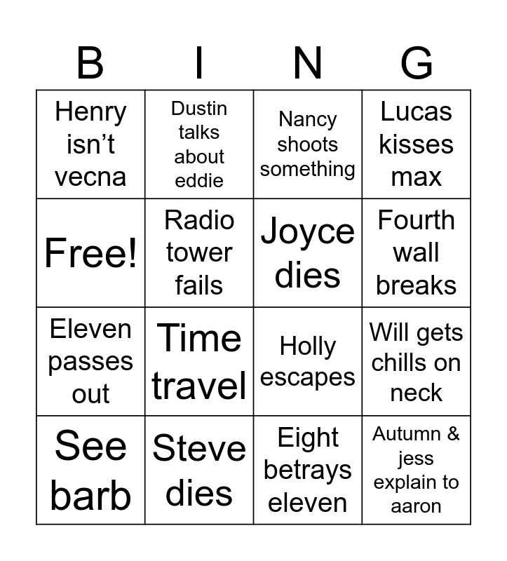 This bingo card has 16 words: Steve dies, Will gets chills on neck, Nancy shoots something, Henry isn’t vecna, Eleven passes out, Dustin talks about eddie, Holly escapes, Eight betrays eleven, Free!, Radio tower fails, See barb, Lucas kisses max, Time travel, Fourth wall breaks, Joyce dies and Autumn & jess explain to aaron.