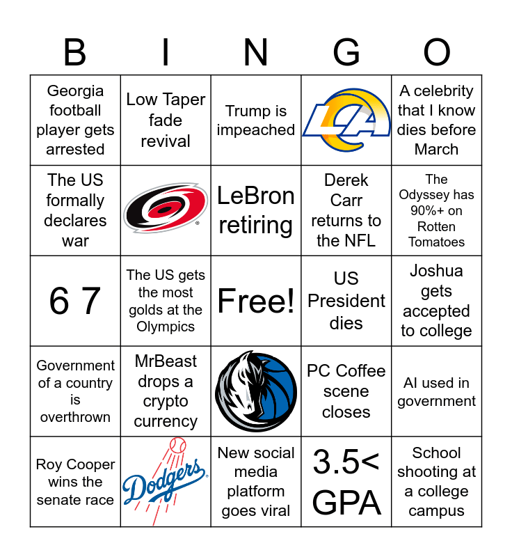 This bingo card has 4 images, a free space and 20 words: MrBeast drops a crypto currency, LeBron retiring, Roy Cooper wins the senate race, A celebrity that I know dies before March, Georgia football player gets arrested, The US formally declares war, Low Taper fade revival, US President dies, Derek Carr returns to the NFL, 6 7, PC Coffee scene closes, AI used in government, 3.5< GPA, Joshua gets accepted to college, Trump is impeached, The Odyssey has 90%+ on Rotten Tomatoes, The US gets the most golds at the Olympics, School shooting at a college campus, Government of a country is overthrown and New social media platform goes viral.