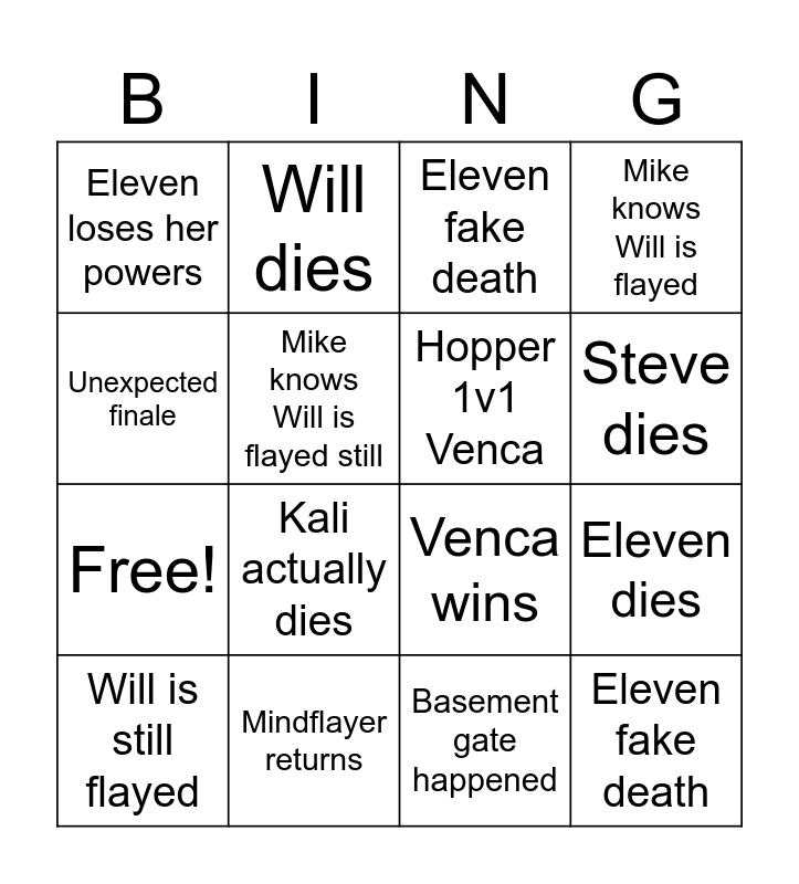 This bingo card has 20 words: Eleven dies, Someone sacrifices themself, Eleven fake death, Everyone’s memories are bugged, Will is still flayed, Unexpected finale, Mindflayer returns, Eleven loses her powers, Free!, Will dies, Kali actually dies, Venca wins, Mike knows Will is flayed still, Eleven fake death, Hopper 1v1 Venca, Steve dies, Steve dies, Mike knows Will is flayed, Basement gate happened and Will is still flayed.