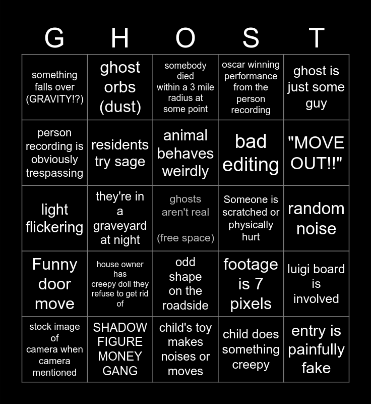 This bingo card has a free space and 24 words: stock image of camera when camera mentioned, house owner has creepy doll they refuse to get rid of, animal behaves weirdly, child does something creepy, ghost is just some guy, something falls over (GRAVITY!?), ghost orbs (dust), somebody died within a 3 mile radius at some point, Someone is scratched or physically hurt, random noise, light flickering, residents try sage, footage is 7 pixels, luigi board is involved, person recording is obviously trespassing, SHADOW FIGURE MONEY GANG, child's toy makes noises or moves, oscar winning performance from the person recording, "MOVE OUT!!", Funny door move, they're in a graveyard at night, odd shape on the roadside, bad editing and entry is painfully fake.