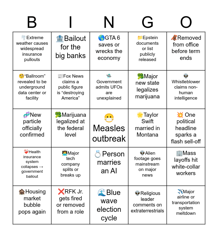 This bingo card has a free space and 24 words: 🧑💻Major tech company splits or breaks up, ❌RFK Jr. gets fired or removed from a role, 🛸Government admits UFOs are unexplained, 🏚️Housing market bubble pops again, 🦧Removed from office before term ends, 🌪️Extreme weather causes widespread insurance pullouts, 🧐“Ballroom” revealed to be underground data center or facility, 🏦Bailout for the big banks, 🌟Taylor Swift married in Montana, 💍Person marries an AI, 🥦Major new state legalizes marijuana, 🧬New particle officially confirmed, 👽Alien footage goes mainstream on major news, 🏢Mass layoffs hit white-collar workers, 📰Fox News claims a public figure is “destroying America”, 👽Religious leader comments on extraterrestrials, 💥 One political headline sparks a flash sell-off, 🌎GTA 6 saves or wrecks the economy, 👽Whistleblower claims non-human intelligence, 🥦Marijuana legalized at the federal level, ✈️Major airline or transportation system meltdown, ❤️🩹Health insurance system collapses → government bailout, 📁Epstein documents or list publicly released and 🌊Blue wave election cycle.