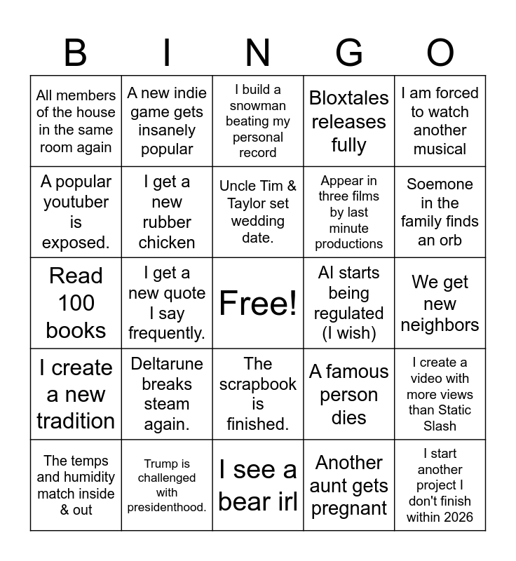 This bingo card has a free space and 24 words: Deltarune breaks steam again., Trump is challenged with presidenthood., Uncle Tim & Taylor set wedding date., The temps and humidity match inside & out, I am forced to watch another musical, All members of the house in the same room again, A popular youtuber is exposed., A new indie game gets insanely popular, AI starts being regulated (I wish), The scrapbook is finished., Appear in three films by last minute productions, Read 100 books, A famous person dies, I create a video with more views than Static Slash, I get a new rubber chicken, Another aunt gets pregnant, We get new neighbors, I build a snowman beating my personal record, Soemone in the family finds an orb, I get a new quote I say frequently., I start another project I don't finish within 2026, I create a new tradition, Bloxtales releases fully and I see a bear irl.