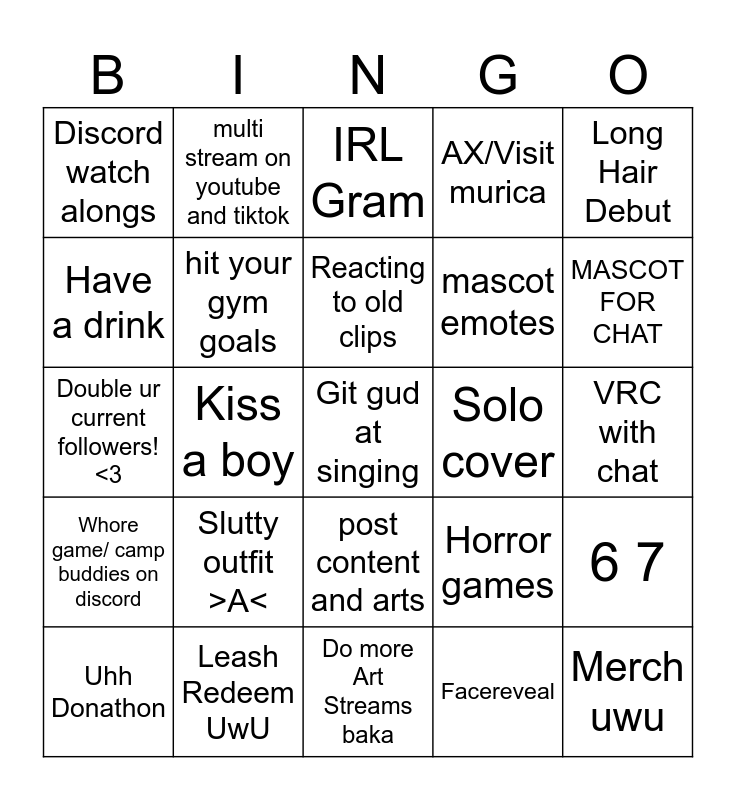 This bingo card has a free space and 44 words: Cosplay, Merch uwu, Git gud at drawing qwq, Uhh Donathon, Birthday Subathon, Facereveal, IRL Gram, Winter outfit debut, Long Hair Debut, Leash Redeem UwU, AX/Visit murica, Solo cover, post content and arts, Slutty outfit >A<, Trevor Project Charity stream, Do more Art Streams baka, ASMR Streams, Double ur current followers! <3, Vtwinks Collabs, MASCOT FOR CHAT, multi stream on youtube and tiktok, Sonic Racing with chat, Get art with sproinny art, Discord watch alongs, Try not to laugh from chat shared videos, VRC with chat, improve on my makesup skills, Celestial in rivals, Horror games, Whore game/ camp buddies on discord, Handcam strims/unboxing, 6 7, Maid OUTFIT, Minecraft, Kiss a boy, FNAF Series, NOT SHORT, Get a new cat :3, Reacting to old clips, Have a drink, mascot emotes, Bali Trip </3, hit your gym goals and GET PARTNER.