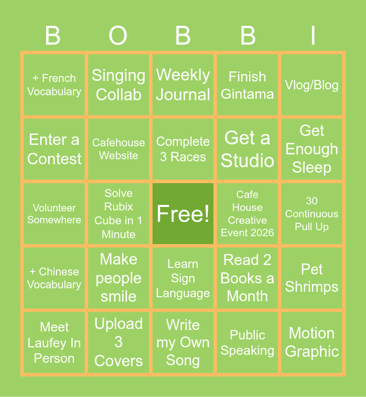 This bingo card has a free space and 24 words: Make people smile, Upload 3 Covers, Complete 3 Races, Meet Laufey In Person, Vlog/Blog, + French Vocabulary, Enter a Contest, Singing Collab, Cafe House Creative Event 2026, Learn Sign Language, Get a Studio, Volunteer Somewhere, Read 2 Books a Month, Pet Shrimps, Cafehouse Website, Public Speaking, 30 Continuous Pull Up, Weekly Journal, Get Enough Sleep, Solve Rubix Cube in 1 Minute, Motion Graphic, + Chinese Vocabulary, Finish Gintama and Write my Own Song.
